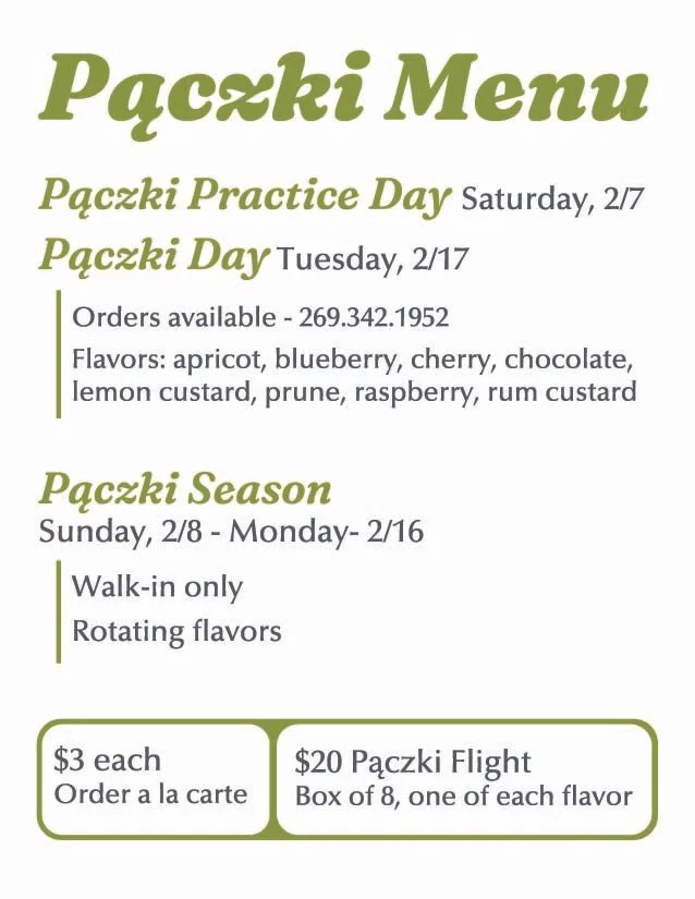 This year Pączki Practice Day is on Saturday, 2/7 and Fat Tuesday is on 2/17! Those are the only two days we will be taking orders. So flag down a baker next time you stop by or give us a call at 269.342.1952 and we’ll get an order together for you! And yes, we’ll have pączki each day at the bakery between Practice Day and Fat Tuesday, but because we won’t have every single flavor every single day (that’s a lot to ask!), we can’t take specific orders. So get your orders in for 2/7 and 2/17 and every day in between will be walk-in pączki only.